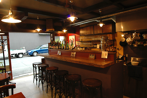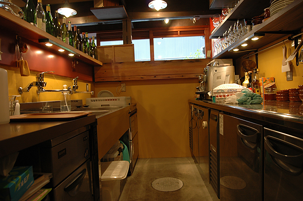 キッチンの壁の鮮やかな黄色がお店の雰囲気を「グッ」とき締めています。 店内奥の壁は煉瓦風のタイルにわざと目地を盛り上げて柔らかな風合いで仕上げました。